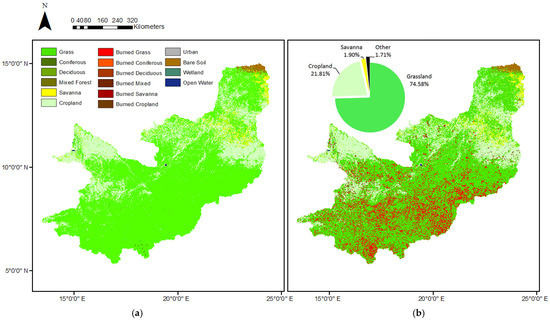 (a). Map showing August 2010 WetSpass-M land cover classifications derived from MODIS MDC12Q1. (b) Map showing January 2010 WetSpass-M land cover classifications derived from MODIS MDC12Q1 superimposed with fire detections (red dots) derived from MODIS MOD14. Pie chart shows land cover percentages in the Chari–Logone catchment area derived from MDC12Q1. Grassland is by far the greatest land cover type, followed by cropland. All other land cover types, such as forest, bare soil, wetland, urban, and open water, are combined into the category “other”.