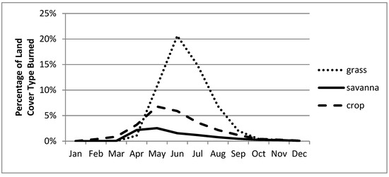 Average percent of monthly burning for major land cover types from 2003 to 2011 taken from MOD14.