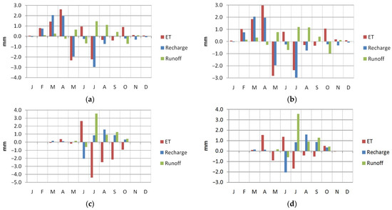 Average monthly output difference of hydrological parameters from the non-burning model subtracted from the model considering burning. Top to bottom panels show burning differences for: (a) all land classes, (b) grassland, (c) savanna, and (d) cropland.