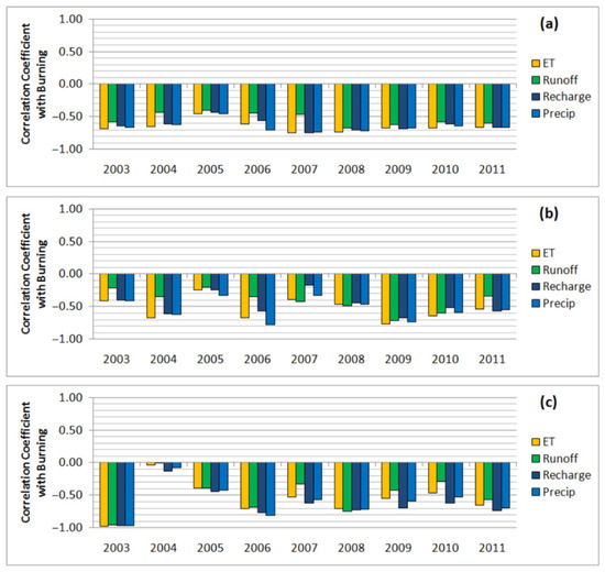 Correlation coefficients between biomass burning count (each count being 2 km × 2 km pixel) from MOD14/MYD14 Collection 5 compared to water balance model outputs, considering burning based on different time periods: (a) integration or averaging through the full-year cycle, (b) integration or averaging through only the dry season, and (c) integration or averaging through only the wet season.