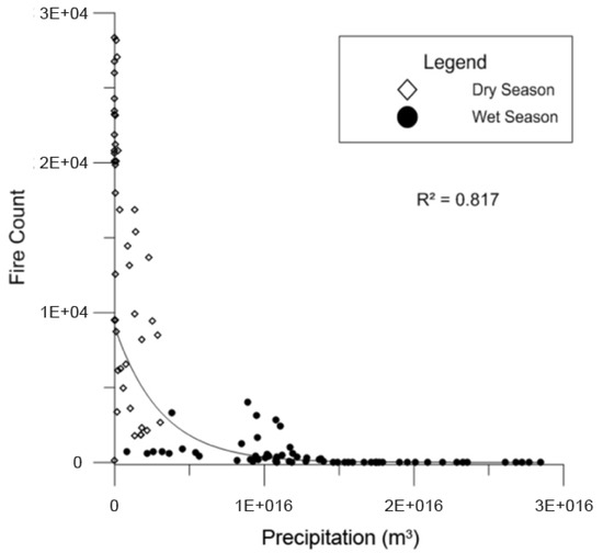 Scatter plot of monthly biomass burning count against precipitation from TRMM showing the demarcation between the wet season and dry season.