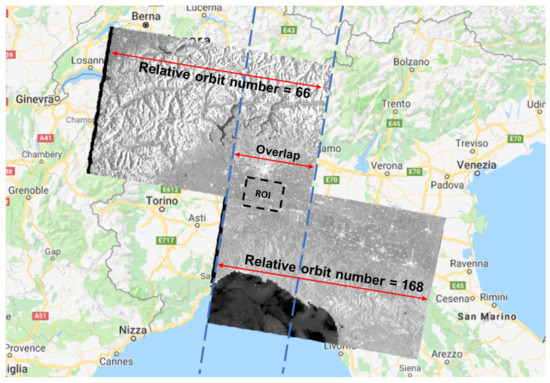 Once the multitemporal dataset covering the entire rice growing season was acquired through the ESA Copernicus Hub, SAR backscatter time-series were extracted for each single considered field. As mentioned above, each sample was computed as the average value of the Normalized Radar Cross Section over the entire field at the given date. The features of Sentinel-1 orbit and sensors at the selected acquisition mode result into yearly time-series composed of 121 samples. The large number of yearly acquisitions is due to the location of the study area, where two descending-orbit swaths of Sentinel-1A and B overlap with each other (Figure 2). The 6-day repeat cycle of a single Sentinel platform, indeed, would itself result into roughly 60 samples per year; the overlapping swaths double this latter figure, although this comes with both pros and cons. The main pro is the increased temporal frequency, whereas the main con is related to the unevenness of time intervals and acquisition parameters between adjacent samples. Time lags between adjacent samples are not evenly spaced 3-day intervals, but they rather alternate a 1-day with a 5-day interval, which adds to the complexity of the analysis. Incidence angles are also different, featuring 33° and 43° for orbit number 66 and 168, respectively. Therefore, in order to correctly use all the available measurements, a normalization of the incidence angle must be performed prior to classification. This can be accomplished using different techniques, such as the popular cosine squared normalization [60], which we applied in our research.
