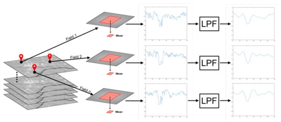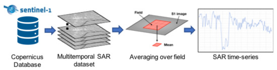 The time-series extraction procedure is depicted in Figure 3. Please note that for the sake of simplicity, Figure 3 does not show all the pre-processing steps applied to the downloaded images, but only those characterizing the proposed method. The classification system, described in Section 5, is entirely based on the extracted SAR time-series.