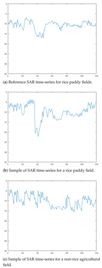 However, SAR time-series on rice fields may have, for example, different mean backscatter intensity values due to several reasons such as how and when the field is prepared to accommodate rice seeds, the sowed variety, the length of the growth cycle and many other environmental conditions. Even if rice field samples preserve their typical radar response, vertical displacements between two compared time-series, caused by the above-mentioned reasons, could lead to classification errors if RMSE alone is used as a similarity metric. An RMSE-based metric, indeed, only accounts for point-wise displacements between two time-series and not for the “overall similarity” of the trends. Despite the good stability of the reference trend (Figure 4a), differences on each single sample tend to bear little connection with the crop type; non-relevant features such as different mean values shifting the overall time-series upwards or downwards even by a small amount can generate enough accumulated RMSE to mis-classify a genuine conventional rice paddy field. Moreover, considering the situation in Figure 4, the reader can note that in this case, rice and non-rice field time-series feature very similar mean values (around −10 dB). Notwithstanding the obvious differences between the samples, this translates into low RMSE which leads a simple, threshold-based classifier to mistakenly identifying the non-rice sample as an actual rice field. For these reasons, the RMSE indicator may be not the best choice as a comparison tool, given its sensitivity to amplitude variations between signals, even with similar overall behavior.
