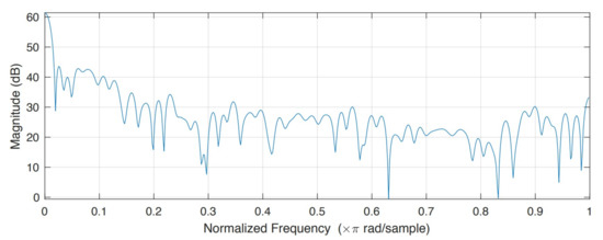 Plot of frequency spectrum magnitude for the reference rice field. Please note that the horizontal axis is normalized to the Nyquist frequency .