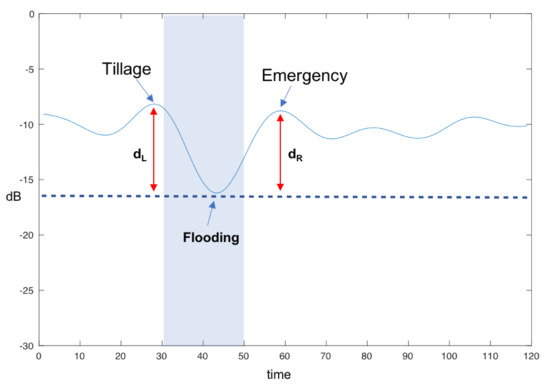 Smoothed, typical rice field SAR time-series. The horizontal axis is denominated by satellite pass count, and the blue band between 30 and 50 roughly marks the typical rice paddy field flooding period in April/May. The parameters and represent the height above the minimum of the peaks on the two sides of the spring reflectivity plunge associated with the customary, longest flooding period. In the proposed classification algorithm, and are compared with a threshold in the process.