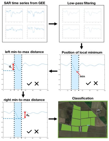 As it can be noted from Table 1, the location of the minimum is quite stable even in the unfiltered SAR sequence, and becomes even more so after filtering as reflected in the decreased standard deviation. The downside of filtering is an increased standard deviation in the depth of the minimum from 1.32 dB to 2.51 dB. Although undesired, this is still acceptable considering that typical off-notch levels float around −10 dB, i.e., 7 dB above the notch floor. Another typical feature of rice paddy fields, also visible in Figure 7, is the presence of two maxima neighboring the minimum, associated with the stages of ploughing (before flooding) and plant emergence (late stages of flooding). These maxima are not due to the overshooting effect of the filter, but rather to an objective situation: both ploughing and emergence increase locally the apparent surface roughness of the observed fields at band-C wavelengths. This shifts the reflection type from mirror to diffuse, thus increasing backscatter [65]. Based on the above analysis, an algorithm was designed to detect the presence of a minimum with a suitable depth in a suitable DoY window, plus the two neighboring maxima. An assessment of mutual distances among such salient points against the operational calendar for traditional rice allows identifying compatible behaviors and suppressing most false positives generated by the previous classification step.