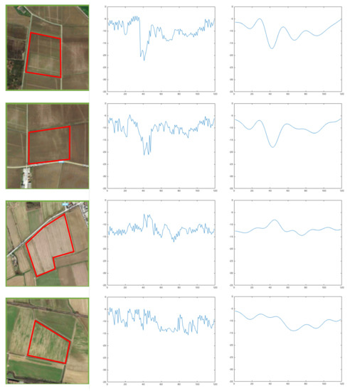 Some examples of field samples and corresponding original and low-pass filtered SAR time-series. The two upper examples refer to rice paddy fields, whereas the two lower ones refer to other types of crops.
