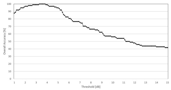 As a first approximation, the min-to-max distance threshold has been chosen by visual interpretation, after analyzing the radar responses of several rice fields. Therefore, to provide a more rigorous definition of such value, the overall accuracy has been evaluated as a function of the distance threshold. To do so, this parameter has been swept across the range 1–15 dB, at 0.1 dB steps. The algorithm automatically classified all samples for each threshold value, and the OA value was recorded in each case; maybe outputs were assigned a score of 0.5 hits as opposed to 1 hit assigned to a correct classification. This was done to partially account also for dubious cases. The accuracy as a function of the threshold parameter was then plotted in a graph, visible in Figure 10.