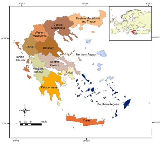 The study was carried out in the 13 administrative Regions of Greece (Figure 1). Data were collected from on-site face-to-face surveys with adult Greek residents (aged 18–80), between March 2017 and September 2018. Cities, towns and villages were visited in all the regions during open market hours (9.00–15.00 and 17.00–21.00, from Monday to Saturday). Every fifth person passing in front of the researcher (I.E.) was asked to participate by completing a questionnaire [31]. In cases in which more than five persons had passed while a questionnaire was being completed, the first person encountered upon completion was selected. It took respondents 15 min on average to complete the questionnaire.