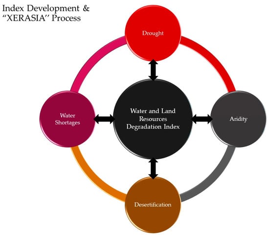 The methodology followed for the development of Water and Land Resources Degradation Index (WLDI) was based on the “XERASIA” process categorization (Figure 1) [22,57]. According to this scheme, aridity is referred to as a permanent natural condition, representing a stable climatic feature of a given region. Drought may be understood as a temporary, mostly climatic, phenomenon, regular and/or unpredicted. Water shortage is associated mainly with small areas of water deficiency usually caused from human activities. Finally, desertification is principally a man-made phenomenon, where the ecological regime is significantly altered. Nevertheless, whatever the term and the overall context, drought should be associated with its impacts at a given area, with its special technological, environmental, economic and societal traits for the area’s vulnerability estimation to various “drought” manifestations. In this regard, the Water and Land Resources Degradation Index (WLDI) is developed including the above four different categories that are important for the initial separation of the types of water deficiencies in relation to natural changes and anthropogenic interventions such as drought, water shortage, aridity, and desertification (Figure 2) [22,23,57].