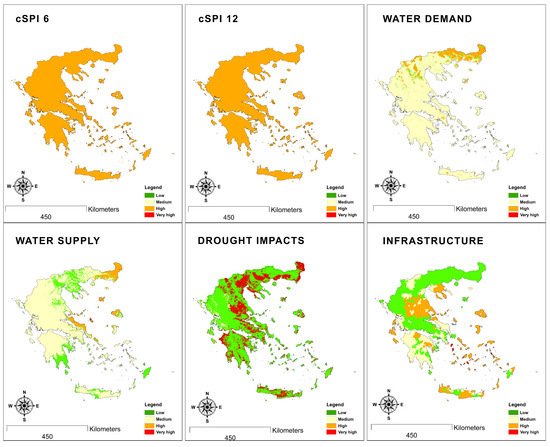 The initial step was gathering data from various databases. In more detail, the climatic parameters were from the National Hellenic Meteorological Service and the National Observatory of Athens [57,58]. Based on these parameters the Standardized Precipitation Index (precipitation), the Aridity Index (precipitation and temperature) and the Rainfall Index (precipitation) were calculated. Then, the transformation from point to spatial distribution was produced by geostatistical methods (Kriging and co-Kriging through ArcGIS 10.8). Data on water demand, water supply, pertinent water infrastructure and drought impacts were gathered from the Water Resources Management Plans of the River Basins of Greece [59]. Impact data have also been acquired from mass media archives, from reduction percentages of the agricultural production for the drought years, and from archive information on various drought impacts and aspects of the corresponding local and national authorities and agencies, all dating from various time intervals. The land-related indicators (Soil Texture, Rock Defragment, Soil Depth, Parent Materials, Drainage and Slope Gradient) were produced from the National Soil Map. Vegetation factors are calculated from CORINE 90s and they related in terms of Fire Risk, the ability to for erosion protection (Erosion Protection) the Drought Resilience, and Plant Cover. Finally, the strategies related to environmental management are classified according to Land Use Intensity and Policy Enforcement.