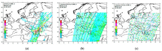 GOME-2 combined MetOp A,B data on 22 August 2017: (a) AOD; (b)VCD_NO2 (µgcm−2); (c) VCD_SO2 (µgcm−2), data shown in BgCWFS domain Europe (see Section 2.2).