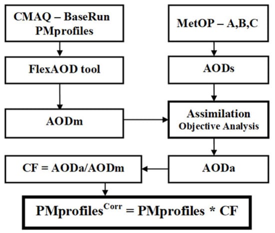 As this was the first attempt to use satellite-retrieved data in BgCWFS, we chose to implement a simple assimilation technique based on optimal interpolation [16,24] and correction of the initial model profiles. The correction factor was calculated as the ratio between BgCWFS vertical column parameters (e.g., AODm estimated by BgCWFS) and the parameters obtained from satellite data (e.g., AODs), and it was further used to modify the profile concentrations, Figure 2. In the case of AOD assimilation, this involved correction of different PM species (type and size mode). The same correction approach was also applied for the vertical column densities of NO2 and SO2.