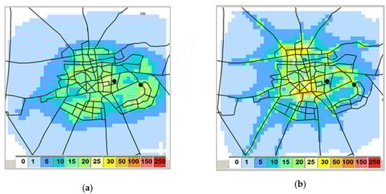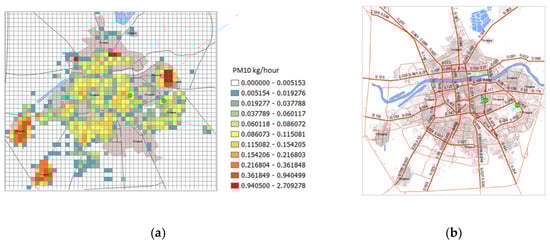 Emissions of PM10 (kg.h−1) for the city of Plovdiv originating from: (a) household heating; (b) traffic at different road segments. The green dots indicate the two AQ stations in the city.