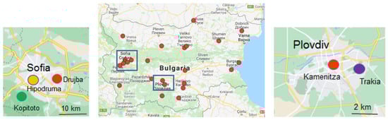 AQ stations (background urban type) used for model evaluation in Bulgaria (middle panel) with zoom for Sofia (left panel) and Plovdiv (right panel). The dots in the zoomed panels indicate stations Sofia-Drujba (BG0052A), Sofia-Kopitoto (BG0070A), Sofia-Hipodruma (BG0050A), and Plovdiv-Kamenitza (BG0051A), for which graphical representation used to compare BgCWFS results to observational data is shown later; Plovdiv-Trakia (BG0078A) (traffic station) was used for LAQMS results.