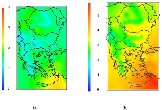 The simulation experiments conducted using the two versions of the system (with and without satellite data), BgCWFS_sat and BgCWFS_mod, for two months (August 2017 and February 2019) showed an increase in the domain mean surface concentrations of PM10, PM2.5, and SO2, while the NO2 values remained almost unchanged. The increase in domain mean PM10 was highest in the summer month (10 µgm−3), where the map for the spatial distribution showed enhanced values especially in the southern and eastern part of the country, corresponding to the mineral dust events with air masses approaching from the south-west and moving towards the north-east. Thus, the assimilation of satellite data provided the possibility to account for emissions not included in BgCWFS. The increase of domain mean SO2 was highest in the winter month (~6 µgm−3) and this is likely due to the relatively high emissions by coal-fired thermal power plants in the Balkan Peninsula. The weak impact of satellites data assimilation on surface and columnar NO2 values confirmed the results in [60].
