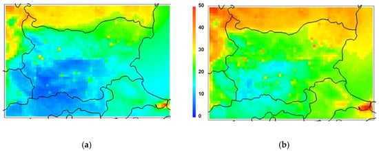 August in Bulgaria is one of the hottest and driest months. August 2017 was characterized by temperatures exceeding the climatic norm by +0.5 °C to +3.9 °C and gross monthly precipitation around the norm. The dry weather was favorable for wildfires, mainly in the south-western and south-eastern regions of the country. The AOD over the country was affected by such fires, but also by Saharan dust outbreaks [43,58]. According to satellite data, higher AOD values were observed on about 12 days in this month. February is usually one of the coldest months in Bulgaria with long-lasting anticyclonic conditions leading to elevated air pollution. February 2019, however, featured mild temperatures (deviation from the monthly climatic norm by 2.1 °C) and less precipitation (deviation from the monthly norm by 52%). The average number of days with clear sky was 10 (higher than the climatic norm); therefore, more satellite data than for other winter months were available.