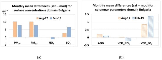 Monthly mean differences (BgCWFS_sat − BgCWFS_mod) averaged for domain Bulgaria: (a) for surface parameters in (µgm−3); (b) for columnar parameters VCD_NO2 and VCD_SO2 in µgcm−2.