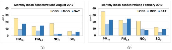 Monthly mean concentrations (µgm−3) from observations (OBS), and from models: BgCWFS_mod (MOD) and BgCWFS_sat (SAT): (a) August 2017; (b) February 2019.