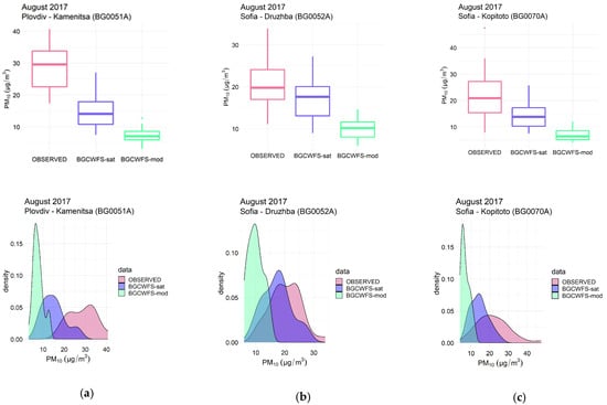 PM10 in August 2017 observed, BgCWFS_sat and BgCFWS_mod and at thee selected stations: (a) Plovdiv Kamenitza (BG0051A); (b) Sofia-Drujba (BG0052A); and (c) Sofia-Kopitoto (BG0070A); top panels—boxplots show minimum, maximum, 25th, 50th, and 75th percentiles, bottom panels—kernel density estimations of the density distribution functions.
