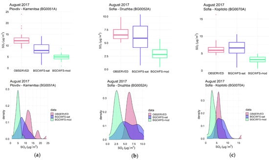 SO2 in August 2017 observed, BgCWFS_sat and BgCFWS_mod and at thee selected stations: (a) Plovdiv Kamenitza (BG0051A); (b) Sofia-Drujba (BG0052A); and (c) Sofia-Kopitoto (BG0070A); top panels—boxplots show minimum, maximum, 25th, 50th, and 75th percentiles, bottom panels—kernel density estimations of the density distribution functions.