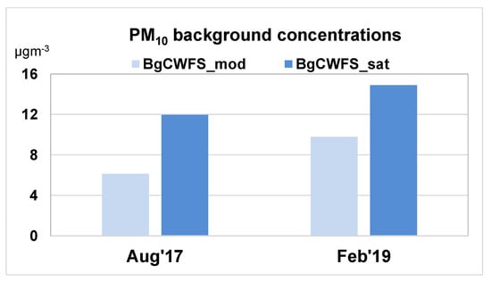 The PM10 background concentrations from BgCWFS_sat were significantly higher than those from BgCWFS_mod, as shown by the monthly mean values in Figure 11. The increase in both months was more than 50%.