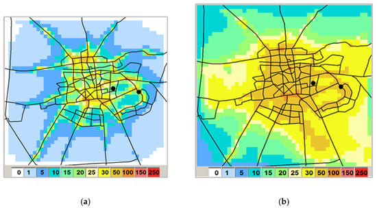 Monthly mean PM10 concentrations (µgm−3) in February 2019 simulated by LAQMS: (a) from household heating, (b) from traffic. The black dots indicate the two AQ stations.