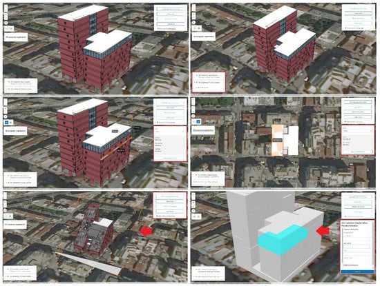 Each volunteer was familiarized with the developed application and was navigated through the 3D building scene, aiming to identify the desired properties. During this process, the users of the web application were able to view both the structural and realistic characteristics of the building by enabling the LoD4 layer through the layer management tab located on the bottom left side of the developed interface. By viewing the realistic model of the 3D world, users recognized their properties faster. Additionally, the volunteer/user utilized the tools provided by the web application in order to measure the building’s characteristics (through measurement tools) or create vertical and horizontal slices of the BIM (through the building slicing tool) to verify the location of his/her property. Once the volunteer/user identified the desired property unit, he/she disabled LoD4 and enabled the LoD1 layer, through the layer management tab, and selected the respective property volume. By clicking on the BIM at the position that he/she assumed that his/her property was located, the 3D volume presenting the legal space where the RRRs are assigned was highlighted. Then, the insertion of the required cadastral information was done by utilizing the editor tool. By selecting the editor tool, a drop-down list appeared, enabling the insertion of data. Once the volunteers collected the required data, they submitted their declarations, which were stored in the cloud of ArcGIS Online, updating the system with the new records. An example of the described registration procedure is presented in