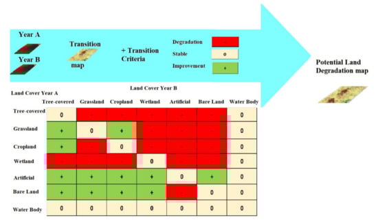 - Land Cover Change: This describes changes in the observed biophysical character of the earth’s surface to help identify areas that may be subject to change. A transition from one land cover type to another may be considered an improvement, a neutral change or degradation, depending on the perspective of the country in question. The procedure followed was to use satellite data from different years, estimate the changes and, according to the transition criteria (Figure 1), estimate the potential land degradation map. This takes into account the various land cover types and assigns a positive, negative or neutral state for each possible change (this is the evaluation metric).