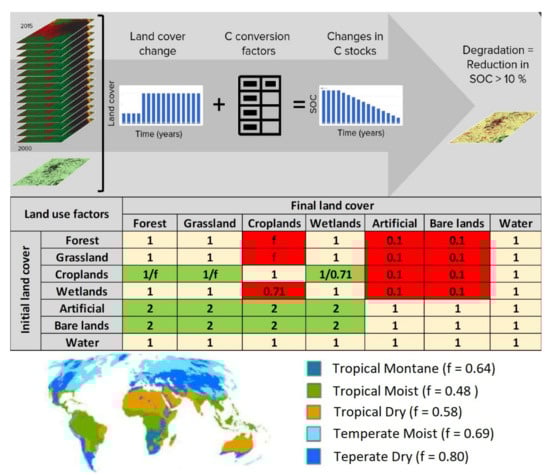 Figure 2. The methodology for the SOC evaluation metric. Carbon change relation to land degradation (up) and conversion factors with different satellite image colours (down). The parameter f converts C emissions to C stock changes, according to the international database of the routine Trends.Earth, in line with the IPCC’s guidelines. Source: Adapted from [22].