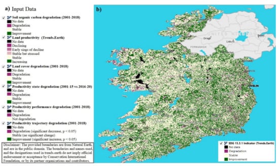 (a) Input Data for the estimation of the SDG15.3.1 (the disclaimer refers to the use of data from Natural Earth repository [44]). (b) The output map with the results of SDG15.3.1. Note: Northern Ireland is under a separate jurisdiction to the Republic of Ireland; thus, its data are not shown in the map.