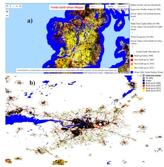 - Trends.Earth Urban Mapper. Available online: https://geflanddegradation.users.earthengine.app/view/trendsearth-urban-mapper (accessed on 9 July 2021).