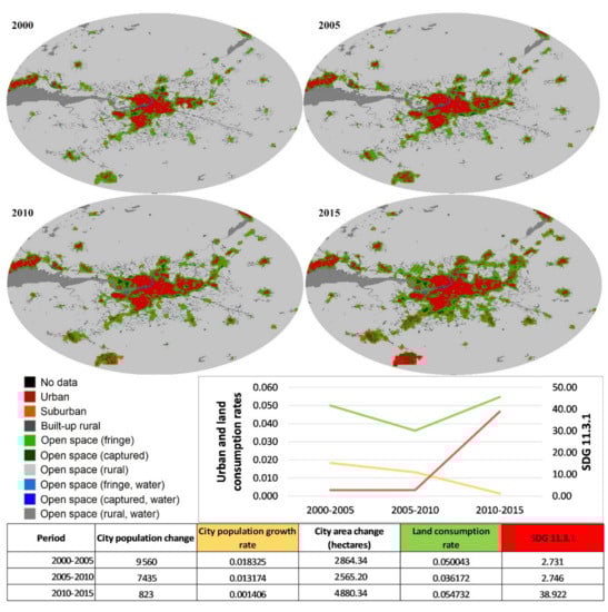 In Figure 7, the trends of the city population growth rate (yellow), the land consumption rate (green) and SDG11.3.1 (red) are shown in the Table and the diagram over the examined time period. The population increment is accompanied by a respective expansion of the city’s area, with an almost stable land consumption rate, which results in a “sustainable” evolution of the 11.3.1 indicator.