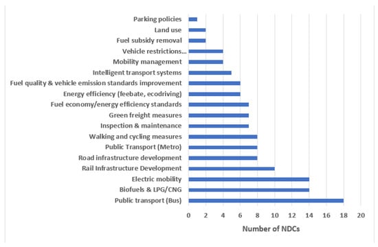 Some of the common transport strategies (Figure 2 and Table 3) in the NDCs are: the improvement of public transport (bus, mass transit, and bus rapid transit); the use of renewable energy; the deployment of electric mobility; fuel economy and vehicle emissions standards; mode shift from road to rail; freight mode shift; the application of smart transport technologies; integrated land use and transport planning; and the promotion of non-motorized transport.