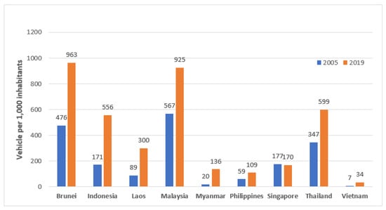 Asia has also witnessed rapid motorization beyond what many cities are able to comfortably absorb. The difference in automobile ownership is still very significant across Asia. The motorization rate in developed Asian countries ranged from 417 to 819 vehicles per 1000 inhabitants compared to rates for developing countries, which ranged between 22 and 38 vehicles per 1000 inhabitants in 2015 [63]. Figure 3 shows the number of registered vehicles per 1000 inhabitants in East Asian countries from 2005 to 2019 [64]. As noted above, one focus of the shift strategy is to reduce the use of personal vehicles and to encourage people to use mass public transit, but high rates of vehicle ownership can be observed in Brunei, Malaysia, and Thailand. It is worth noting that only Singapore has managed to reduce this indicator.