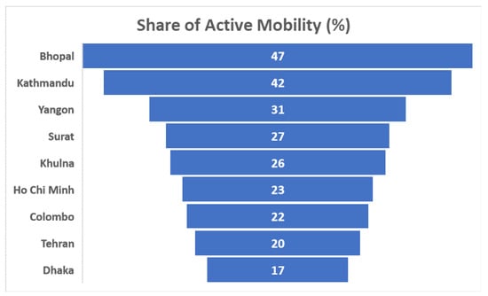 Mode share of active mobility in Asia. Source: Compiled from [54].