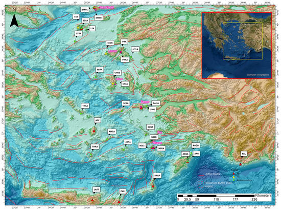 - Bocchini, G.M.; Brüstle, A.; Becker, D.; Ruscic, M.; Rische, M.; Papadopoulos, G.A.; Meier, T.M. Slab Segmentation in the South-Eastern Aegean: Evidence from Seismicity; AGU: Washington, DC, USA, 2016. [Google Scholar]
