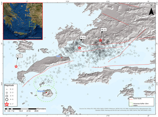 In the last ten years, which is the main object of this work, a strong earthquake of magnitude Mw = 6.6 occurred offshore, east of the island of Kos and south of the town of Bodrum, SE Aegean Sea. According to the literature [25,26,27], this earthquake was the largest since the catastrophic earthquake (600 injuries) that occurred in 1933 (Mw = 6.5) in the greater area of Kos. The Kos earthquake happened in predominantly extensional tectonics as evidenced by the formation of Quaternary marine grabens, namely the NE–SW Kos graben [28,29] and the east–west trending Gökova graben [30,31,32,33].