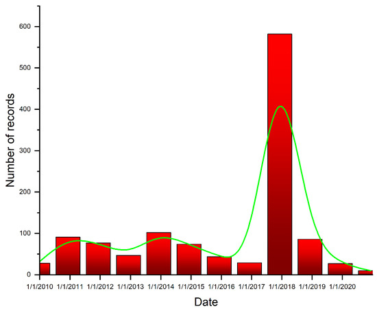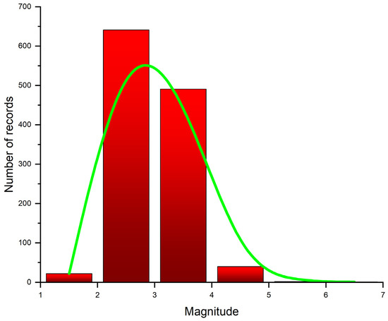 The earthquake’s location, depth, and magnitude are calculated automatically by the SeisComp3 [48,49]. The magnitude used to characterize this database is the local magnitude (ML). Figure 3 shows the distribution of seismological recordings per year and Figure 4 the number of records relative to the magnitude. The number has increased in recent years because, at present, there are more stations.