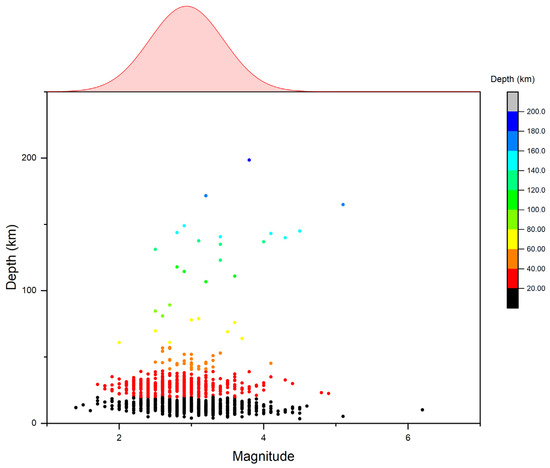 Table 3 shows a statistical summary of the number of records per different ranges of magnitude and depth. As we can observe from the table, the depth of most earthquakes was estimated between 10 and 20 km for magnitudes 2.0 ≤ ΜL < 4.0. For less than 40 events (Nr = 37), the depth was initially calculated to be greater than 50 km. The majority of earthquakes (Νr = 1.010) that occurred within this period had a depth between 5 and 20 km, which is in good agreement with the results of other works [50,51].