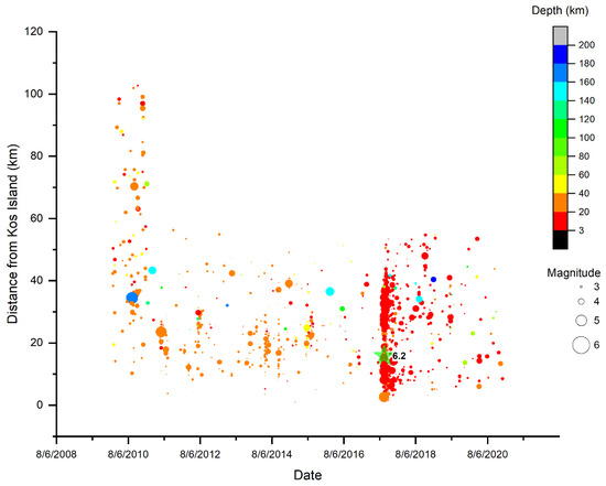 - From 2010 onwards, there was a gradual lower distance of the epicenters from the island of Kos. More specifically, in 2010, the epicentral distances were at 100 km, while in 2017, the earthquake (ML 6.2) was observed with epicenters up to 45 km. This partially confirms the study [52] regarding the Mogi [53] doughnut but needs further analysis to confirm this.