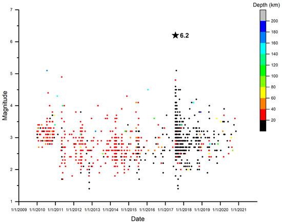 Ιn Figure 5, we can observe the distribution of the magnitude of earthquakes as a function of depth. Ιn this diagram, it is observed that the depths range mainly between 5 and 40 km, including the largest earthquake of the last decade that occurred on 20 July 2017, ML 6.2.
