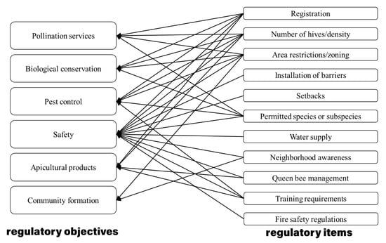 Sponsler and Bratman [16] classified the socio-ecological aspects of urban beekeeping into six categories: pollination services, resource competition, disease transmission to other insects, stinging, apicultural products and livelihoods, and expert community formation. Based on these frameworks, we applied the following six criteria to each regulatory objective and (Table 2):