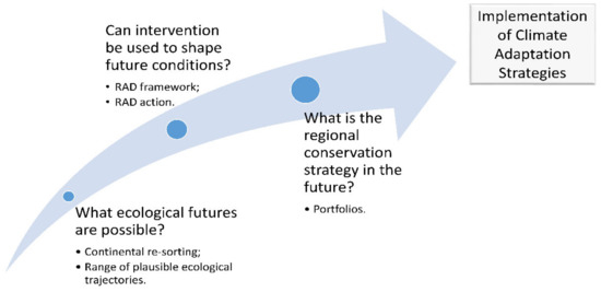 The RAD framework (Figure 2) helps managers consider alterative management responses to ecological change [1,16]. RAD expands focus from historical or current conditions to consider how the use of management intervention could be used to shape future outcomes across the range of plausible ecological trajectories [35,40]. Implementing RAD requires the development of local interventions that are both targeted to the unique natural and management history of a specific place and contextualized by regional climate change vulnerability. Adaptive pathway planning can help managers implement RAD by preparing for interventions and removing barriers to acting prior to contingency events occurring. If successfully applied, the RAD framework should result in appropriate action on the ground.