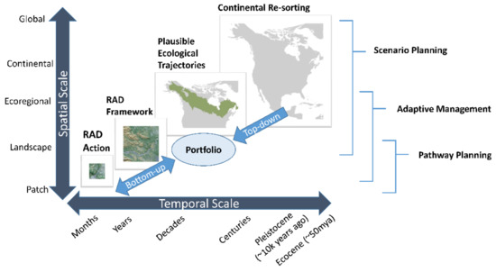 Blueprint for building a decision context to implement climate change adaptation on National Wildlife Refuges in the United States. The blueprint integrates multiple spatial and temporal scales, management considerations (continental resorting, plausible ecological trajectories, the RAD framework, and RAD actions), and assessment approaches (scenario planning, adaptive management, and adaptive pathway planning). The management considerations are needed to understand what future conditions are possible, how intervention can be used to shape future conditions, and to coordinate regional conservation strategies. Portfolios consist of suites of RAD strategies that are being applied in different places. Local RAD actions can be informed by and coordinated into (bottom-up arrow) a portfolio that can also be informed by regional climate vulnerability (top-down arrow). Scenario planning can be applied at large spatial scales, while adaptive management is applied at regional, landscape, and local scales. Pathway planning is context dependent and best applied at landscape and local scales.