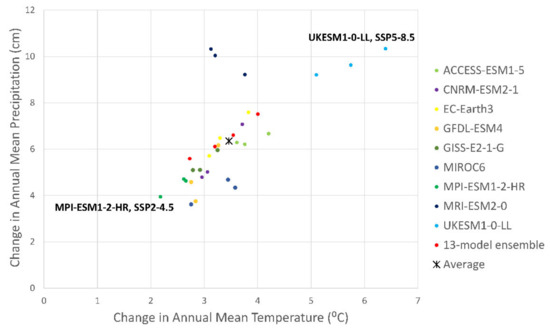 Spread of climate futures projected with 9 individual AOGCM and a 13-model ensemble using 4 CMIP6 emission scenarios (SSP1-2.6, SSP2-4.5, SSP3-7.0, SSP5-8.5). Change in average annual mean temperature and average annual total precipitation for the 2040–2071 projection relative to the 1961–1990 historical period for the Tetlin National Wildlife Refuge. The average represents 31 projections: 9 AOGCMs × 3 emission scenarios (SSP1-2.6, SSP3-7.0, SSP5-8.5) and the 13-model ensemble × 4 emission scenarios (SSP1-2.6, SSP3-7.0, SSP5-8.5). The least warm and wet (MPI-ESM1-2-HR, SSP2-4.5) and the most warm and wet (UKESM1-0-LL, SSP5-8.5) projection extremes are labelled.