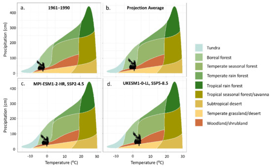 Tetlin National Wildlife Refuge climate space is represented by the pixel values for the average annual temperature (°C) and average annual precipitation (cm). Four Whittaker’s biome plots are used to overlay the historical 1961–1990 climate normals (a) and 3 climate futures for 2041-2070 in the refuge (black points). The projection average (b) is based on 31 climate projections: 9 AOGCMs × 3 emission scenarios (SSP1-2.6, SSP3-7.0, SSP5-8.5) and a 13-model ensemble × 4 emission scenarios (SSP1-2.6, SSP3-7.0, SSP5-8.5). The MPI-ESM1-2-HR, SSP5-4.5 projection (c) represents the least warm and wet climate future. The UKESM1-0-LL, SSP5-8.5 projection (d) represents the warmest and the wettest climate future.