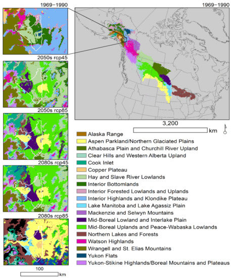 Ecoregional climate envelop model developed by Stralberg [56]. The model is based on bioclimatic variables using the 1961–1990 climate normals and forecast to climate futures in the 2050s and 2080s using CMIP5 rcp4.5 and rcp 8.5 emission scenarios and a 15-model ensemble. The boundary of the Tetlin National Wildlife Refuge, Alaska is the focus of the zoomed in boxes.