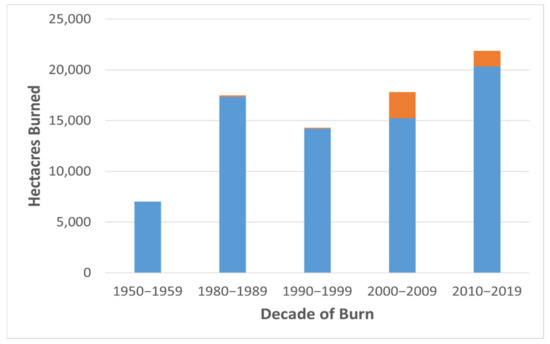 Area burned by decade on the Tetlin National Wildlife Refuge from 1940–2020. The 1940–1949 decade is not included because no fires occurred. Reburned area with <40 years since last burn is orange and mature forest area burned is blue.